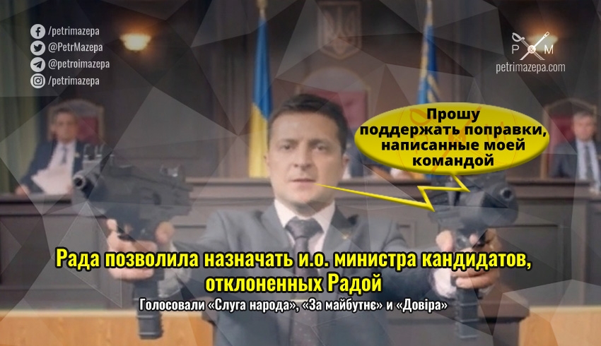 Теперь по сути, если в Верховной Раде кандидат на должность министра был воспринят негативно и не прошел утвержденную процедуру, Кабмин вместе с ОПУ могут не учитывать мнения народных избранников и ставить этого человека и.о. министра с теми же полномочиями, которые были бы у министра.