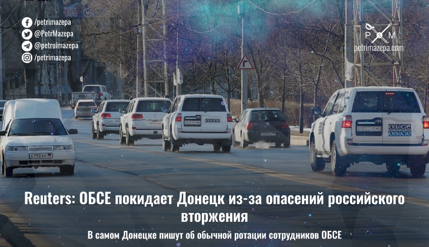 Как отмечает Reuters, отъезд состоялся «на фоне опасений возможного российского вторжения». На запрос американских журналистов о комментарии ОБСЕ не ответила. На фото, опубликованных Reuters можно увидеть, что кроме стандартных белых машин ОБСЕ, загружают, как минимум, один брендированный прицеп.