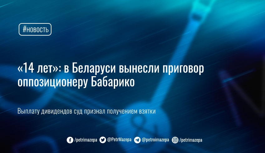 Верховный суд Беларуси приговорил Бабарико к 14 годам лишения свободы в колонии усиленного режима по статьям о получении взятки в особо крупном размере и легализации средств, полученных преступным путем, пишет «Медуза». Сам оппозиционер вины не признал.