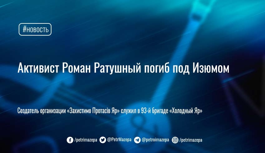 Под Изюмом во время выполнения боевого задания погиб активист, создатель инициативы «Захистимо Протасів Яр» Роман Ратушный. Об этом сообщается на странице организации в Facebook.