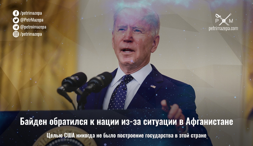 Президент США Джо Байден обратился к нации из-за ситуации в Афганистане – напомнил, что договоренности о выведении войск заключал еще Трамп, что целью США никогда не было построение демократического правительства в Афганистане, и что американские войска нельзя заставлять воевать за афганские силы, если сами афганцы этого не делают.