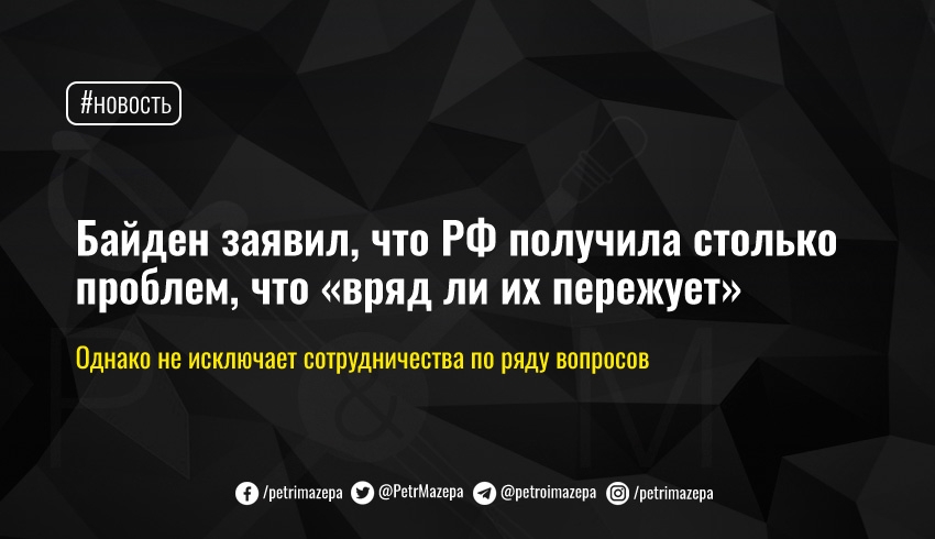 На пресс-конференции после саммита лидеров G7 президент США Джо Байден заявил, что РФ получила столько проблем, что ей будет трудно их пережевать и согласился с президентом страны-агрессора Владимиром Путиным в том, что отношения между Штатами и Россией находятся на низшей точке.