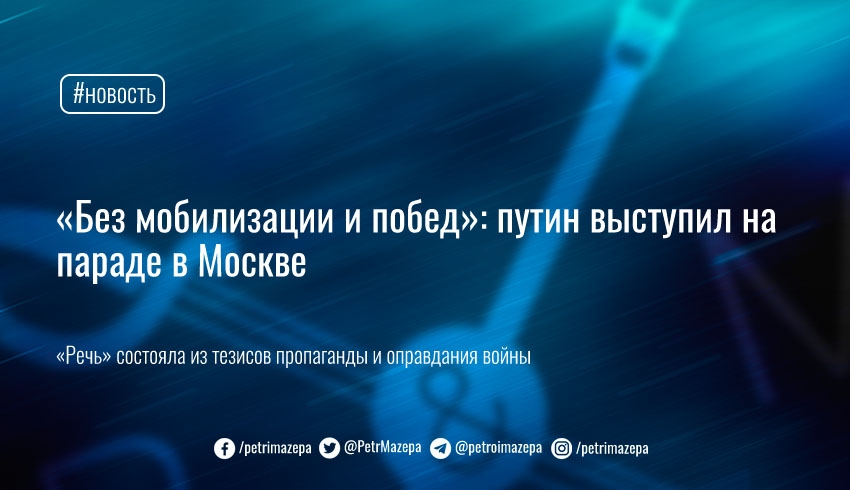 Российский диктатор путин выступил на параде победы в своей столице — ни о каких «победах» не рассказывал, мобилизацию не объявлял, как обычно ограничившись в публичной речи только повторением тезисов пропаганды и попытками оправдать агрессию якобы «защитой россии».