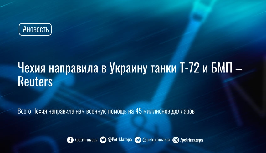Чехия направила в Украину танки Т-72 и боевые машины пехоты BVP-1, сообщает издание Reuters со ссылкой на источник, а также данные местных СМИ. Официально Чехия не подтверждает, но и не опровергает отправку такой помощи, однако заявляет о намерении и дальше поставлять нам как легкую, так и тяжелую технику.