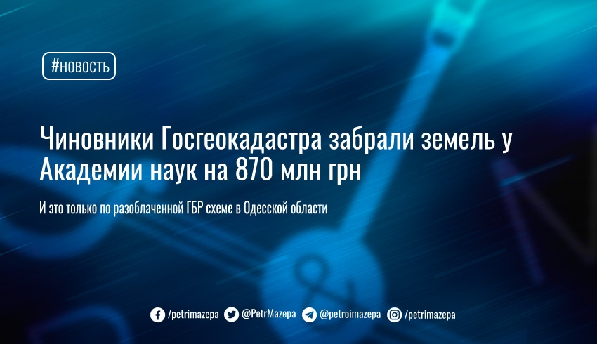 В 2016-2017 годах бывший руководитель Госгеокадастра в Одесской области незаконно издал приказы о передаче земли НААН Украины 39 физическим и 2 юридическим лицам. В 2020 году сделка с землей НААН Украины повторилась, но с участием другого руководителя ГУ Госгеокадастра в Одесской области. В этот раз было незаконно отчуждено 72 га ценных земель".