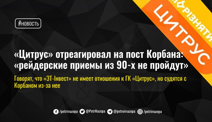 В пресс-службе «Цитруса» ответили на пост Геннадия Корбана с обвинениями и информацией про судебные иски, своим постом. В котором указали, что Корбан пытается «очернить репутацию компании Цитрус», хотя сам обладает «сомнительной деловой репутацией». А также заявили, что «ЗТ-Інвест» не имеет отношения к ГК «Цитрус», но группа компаний судится с Корбаном из-за наличия у последнего документов на управление 50% долей «ЗТ-Інвест».