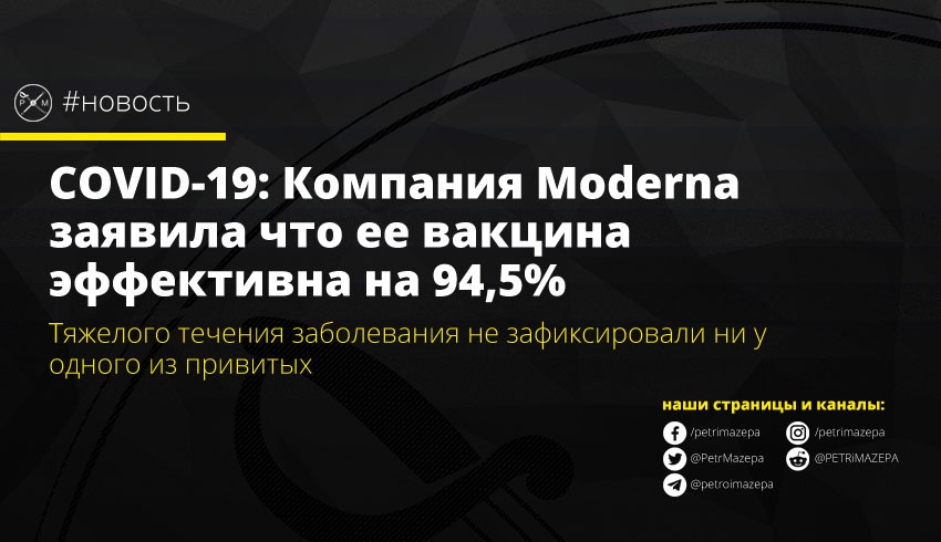 Компания Moderna, которая занимается разработкой вакцины от COVID-19, поделилась первыми обнадеживающими результатами исследований – вакцина показала эффективность на уровне 94,5%.