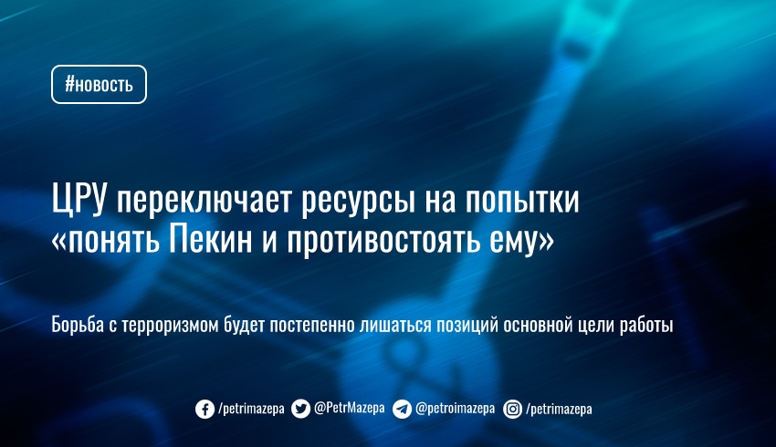 Центральное разведывательное управление (ЦРУ) США переориентирует свою деятельность с борьбы против терроризма на Китай. Официально борьба с терроризмом еще будет оставаться основной целью некоторое время, но все больше материальных и людских ресурсов будет переключаться на работу по китайскому направлению.