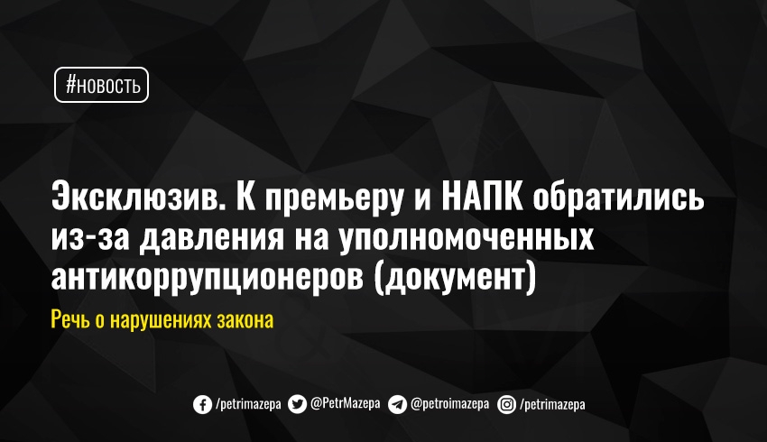 Об этом говорится в письме других уполномоченных по борьбе с коррупцией на имя премьера Дениса Шмыгаля и главы НАПК Александра Новикова, которое есть в распоряжении «Петра и Мазепы».