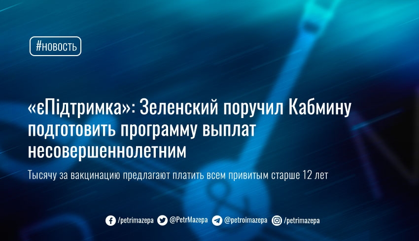 Президент Владимир Зеленский во время селекторного совещания поручил Кабинету министров разработать программу выплат «тысячи за вакцинацию» в рамках программы «єПідтримка» привитым несовершеннолетним.