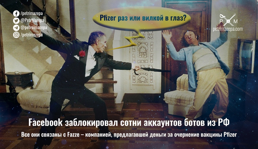 Компания Facebook в июле заблокировала более 300 аккаунтов российских ботов в Facebook и Instagram. Все они связаны с компанией Fazze, зарегистрированной в Великобритании, но действовавшей в основном из РФ. Ранее блогеры в Европе заявляли, что именно от этой компании им поступали предложения очернить вакцину от COVID-19 компании Pfizer.