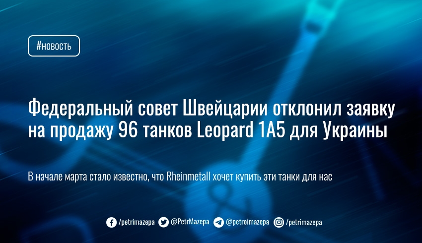 Федеральный совет Швейцарии отклонил заявку швейцарской же компании Ruag на продажу 96 танков Leopard 1A5 с последующей передачей их Украине.