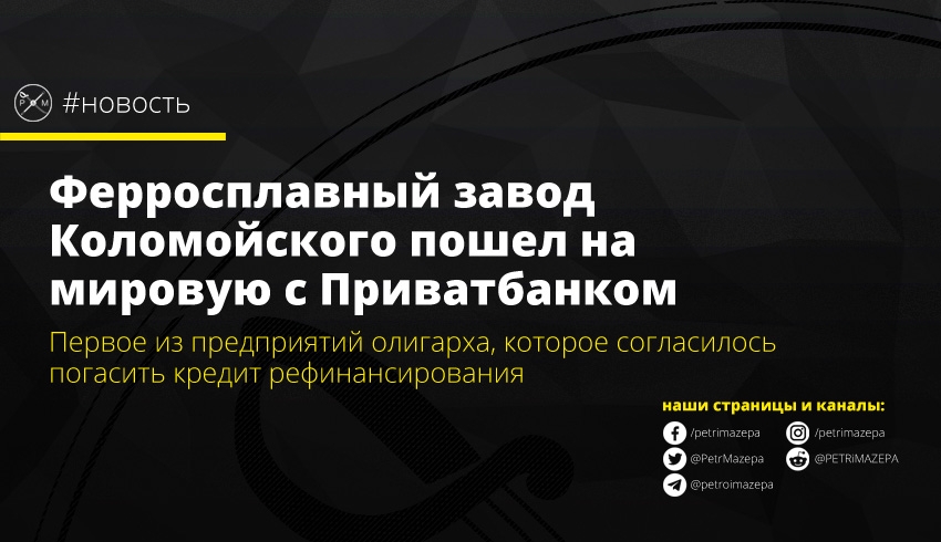 АО «Никопольский завод ферросплавов», которое связано с бывшим владельцем «Приватбанка» Игорем Коломойским, выступило инициатором мирового соглашения, по которому обязуется погасить задолженность перед национализированным «Приватбанком» по кредиту рефинансирования. Это первый подобный случай, когда предприятие из орбиты олигарха согласилось вернуть долги по кредиту рефинансирования.