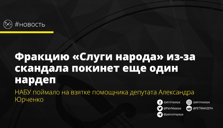 НАБУ разоблачило на взятке помощника депутата фракции «Слуги народа» Александра Юрченко, поэтому он добровольно выйдет из фракции на время расследования.