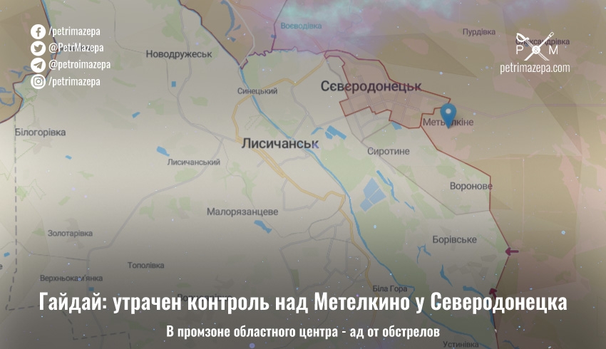 В районах Тошковки и Устиновки рашисты продолжают пытаться прорвать линию фронта. Для этого стянули туда большое количество техники. Бои идут во многих поселках и селах вокруг Северодонецка и Лисичанска. «К сожалению, сейчас мы не контролируем Метелкино вблизи областного центра», — написал утром Гайдай.