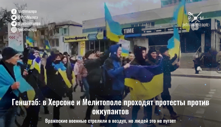 Генштаб Вооруженных сил Украины сообщает, что во временно оккупированных Херсоне и Мелитополе проходят протесты против российских войск.