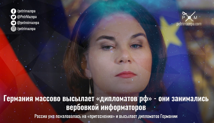 Германия массово высылает российских «дипломатов» — на это пожаловалось «министерство иностранных дел» россии, которое уже анонсировало высылку немецких дипломатов. При этом МИД само признало, что Германия сообщила об этом в СМИ — а недавно именно СМИ сообщали, что этих «дипломатов» высылают за то, что они под прикрытием дипломатического статуса занимались незаконной вербовкой информаторов для проведения даже диверсий.