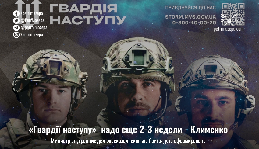 Восемь бригад «Гвардії наступу» уже полностью сформированы — им надо еще 2-3 недели подготовки, после чего после получения боевого задания они поступят под командование Сил обороны. Об этом сообщает министр внутренних дел Украины Игорь Клименко.
