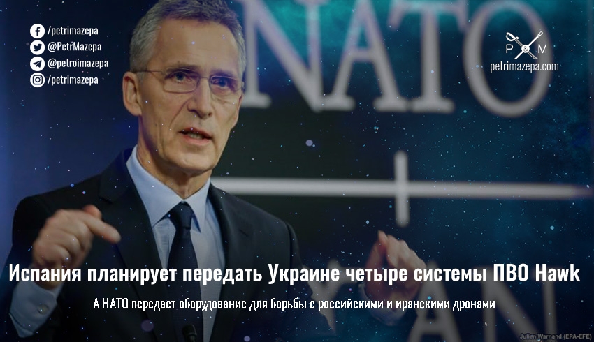 Испания намерена передать украинским защитникам четыре системы ПВО Hawk в рамках военной помощи. Также сообщается, что НАТО в ближайшее время передаст Украине оборудование для борьбы с российскими беспилотниками, в том числе дронами-камикадзе иранского производства.