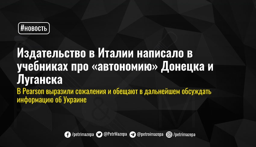 В учебнике по географии для учеников итальянской средней школы издательство Pearson написало про автономию Донецка и Луганска, а также про «референдум» в Крыму, но не про агрессию РФ. Издательство выразило свои сожаления по поводу этой ситуации, и подчеркнуло готовность обсуждать содержание учебников в той части, в которой это касается Украины.