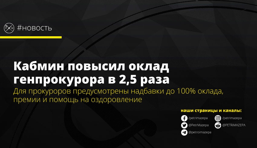 Кабинет министров Украины повысил месячный должностной оклад генерального прокурора с 37 тыс грн до 93,6 тыс грн. Повышены оклады также его заместителям, руководителям областной и окружной прокуратур. Также руководители теперь могут самостоятельно назначать надбавки до 100% от оклада, премирование прокуроров и помощь на оздоровление при ежегодном отпуске, в размере до 100% среднемесячной зарплаты.