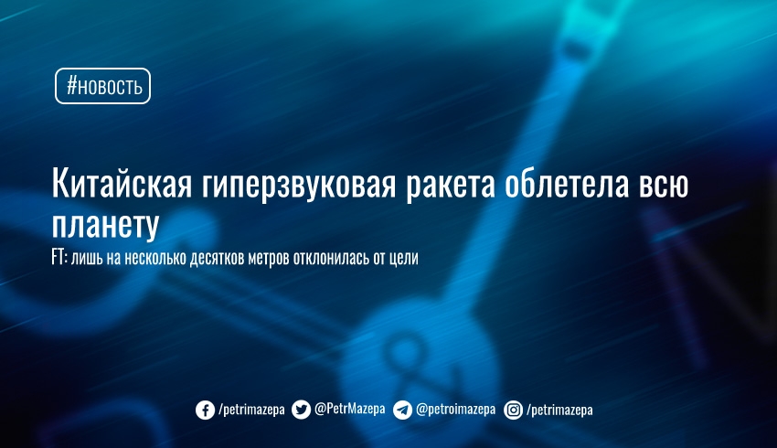 Китайская гиперзвуковая ракета, способная нести ядерный боезаряд, в августе облетела всю планету перед тем как поразить цель. В СМИ сообщают, что гиперзвуковой планирующий блок лишь на несколько десятков метров отклонился от цели