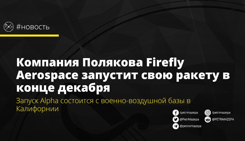 Ракета Alpha компании Firefly Aerospace, которую в 2017 году выкупил украинский предприниматель Максим Поляков, совершит полет 22 декабря сего года.