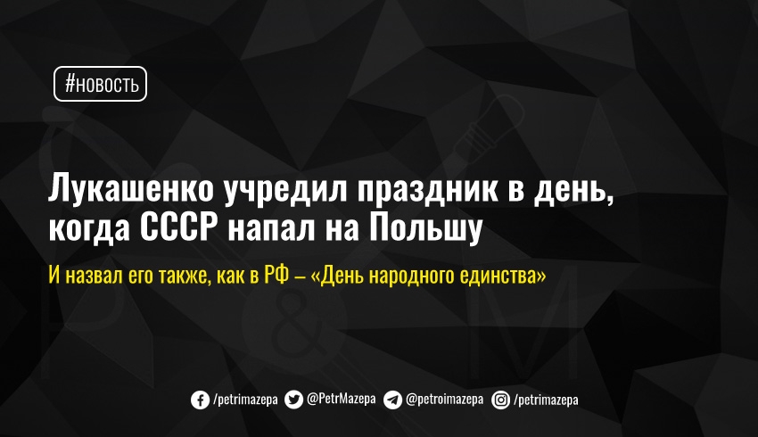 Самопровозглашенный президент Беларуси Александр Лукашенко подписал указ о новом празднике – Дне народного единства (в РФ есть одноименный праздник). Его будут отмечать 17 сентября - в 1939 году в этот день советские войска без объявления войны перешли границу Польши, которая с 1 сентября вела войну против гитлеровской Германии.
