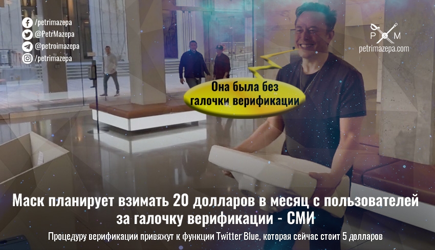 Американские СМИ сообщают, что купивший Twitter Twitter американский миллиардер Илон Маск поставил ее сотрудникам задачу в сжатые сроки подготовить изменения в тарифном плане. Планируется, что дополнительную подписку Twitter Blue сделают вчетверо дороже и привяжут к ней функцию предоставления галочки верификации.