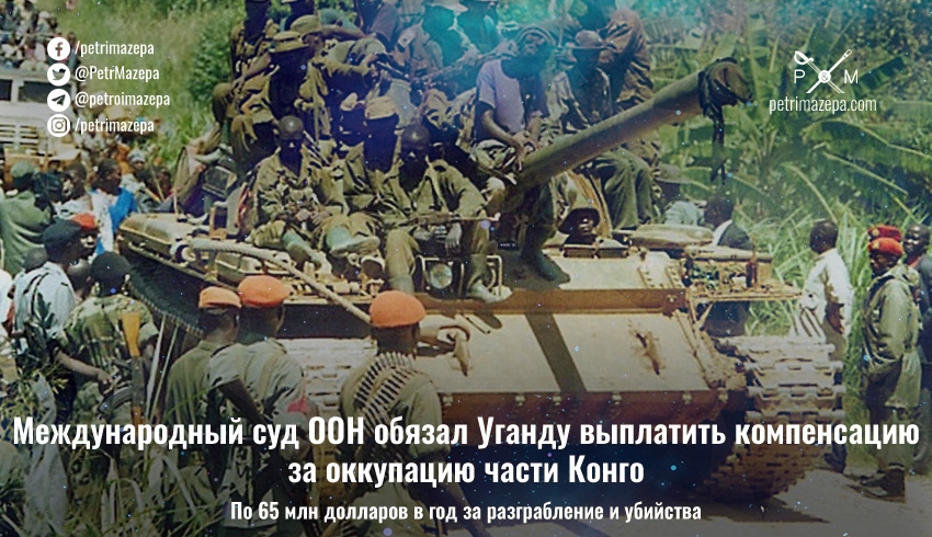 Международный суд (МС) ООН постановил, что Уганда нарушила международные нормы, когда способствовала оккупации части Демократической республики (ДР) в период с 1998 по 2003 год. В период оккупации погибло 10-15 тысяч человек в восточной части региона Итури. А также угандийские войска вывозили из оккупированного региона золото, алмазы и древесину.