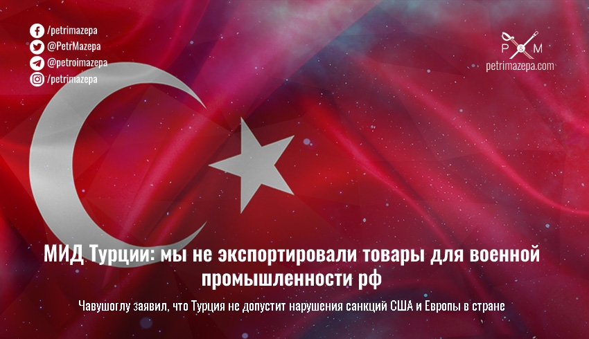 Министр иностранных дел Турции Мевлют Чавушоглу заявил, что информация о том, что Турция экспортировала в россию продукцию, которая может быть использована в оборонной промышленности, неправдива. «Мы попросили Соединенные Штаты уведомить, если есть какие-либо нарушения по этому вопросу», — сказал Чавушоглу, передает Reuters.