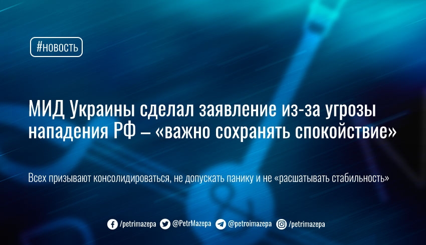 Министерство иностранных дел Украины выпустило официальное заявление по поводу угрозы со стороны РФ – подчеркивают, что власти делают все возможное, Украина имеет жесткую позицию, ВСУ ко всему готовы, надо сохранять спокойствие и «не расшатывать стабильность».