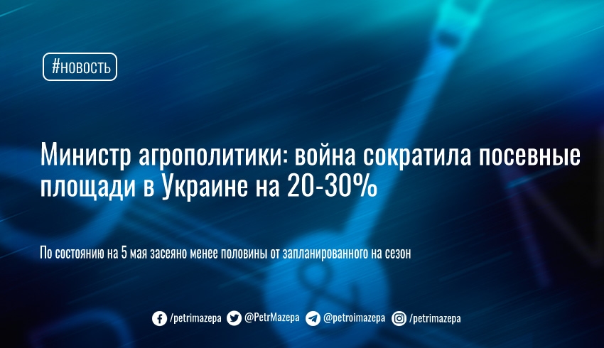 В ходе посевной-2022 к 5 мая засеяно основными с/х культурами 7,1 млн га земель, что составляет 49,3% от запланированных на текущий сезон 14,4 млн га. В прошлом году было засеяно в 16,9 млн га.