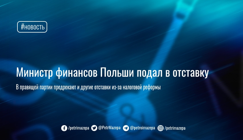 Министр финансов Польши Тадеуш Косциньский подал в отставку из-за спорной налоговой реформы «Польский строй». Должность главы Минфина временно займет премьер-министр Матеуш Моравецкий. После назначения нового министра финансов в правящей партии допускают и другие отставки.