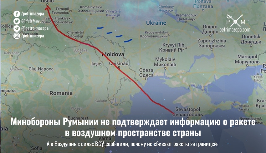 Министерство обороны Румынии не подтверждает информацию о пролете российской ракеты над территорией страны. А в ВСУ сообщают, что не сбивают ракеты за границей из-за «рисков и угроз населению иностранного государства»