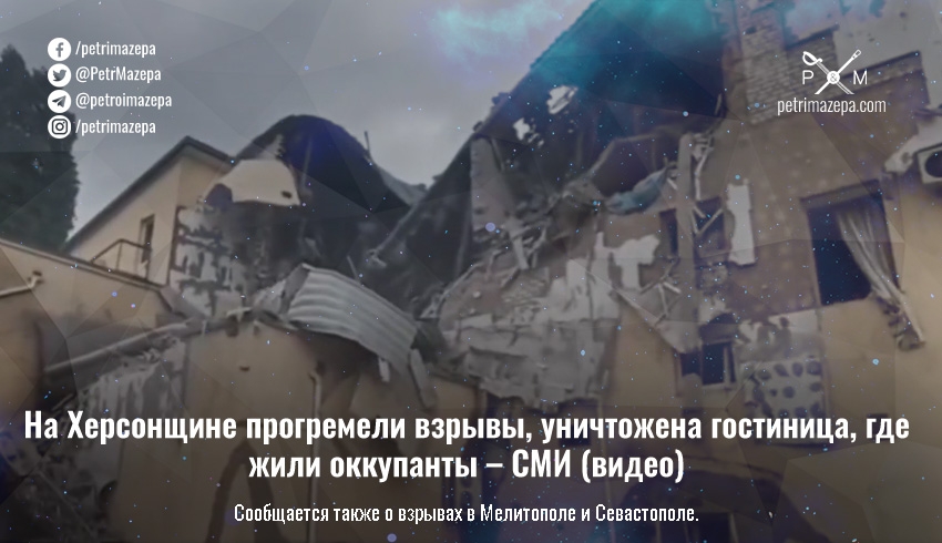 Местное издание «Мост» сообщило о мощных взрывах в оккупированном Херсоне — по их данным, было уничтожено заведение, где долгое время жили оккупанты и коллаборанты. Также сообщается о взрывах в оккупированных Мелитополе и Севастополе.