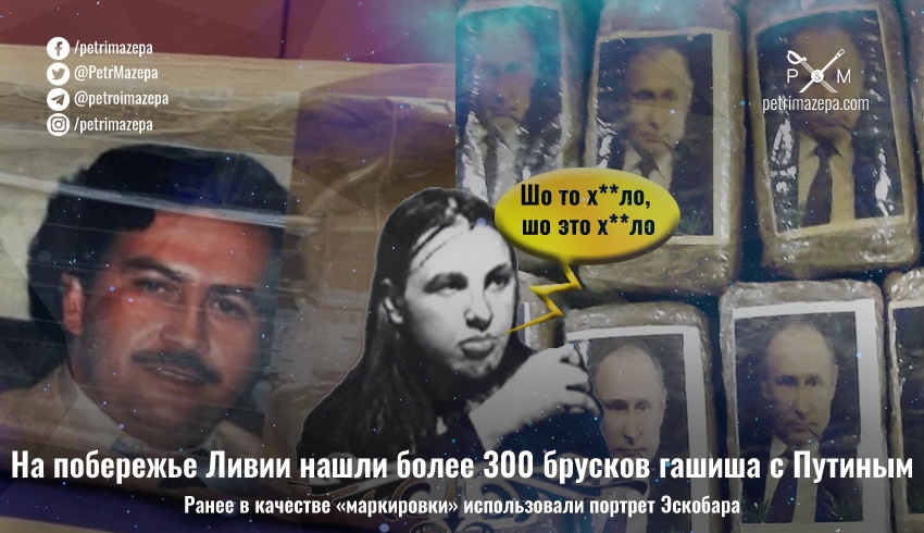 В Ливии на берегу моря обнаружили 323 бруска гашиша с изображением президента России Владимира Путина. Ранее, по данным местных жителей на берег выбросило еще одну партию гашиша, которая была отмечена портретом Пабло Эскобара.