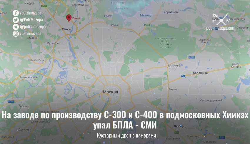 Пропагандисты из ТАСС также сообщают, что дрон упал в Подмосковье на заводе «Факел». Этот завод входит в концерн «Алмаз-Антей», и среди его разработок в том числе «С-300», из которых регулярно обстреливают наши города, «С-400», «Тор» и другие.