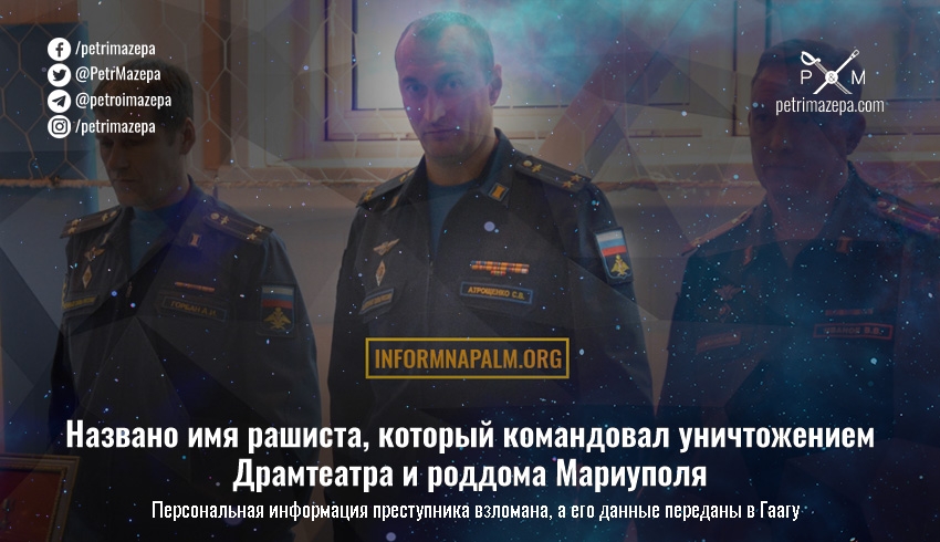 Установлена личность человека, который отдавал приказы и контролировал уничтожение Драматического театра, роддома, детской больницы и других объектов Мариуполя — это полковник Сергей Атрощенко, авиаполк которого базируется в Приморско-Ахтарске, Краснодарский край.