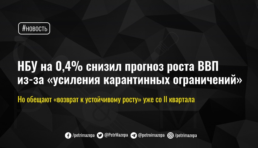 В НБУ отметили, что «экономика Украины восстанавливается, но медленнее, чем ожидалось» и поэтому снизили свой прогноз роста ВВП в 2021 году с 4,2% до 3,8%. Но улучшили до 4% в 2022 году.