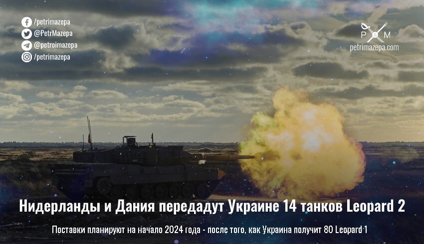 Дания и Нидерланды договорились совместно отправить в Украину 14 танков Leopard 2. Они будут готовы к поставке в начале 2024 года. А до конца 2023 года планируется поставить в Украину не менее 80 Leopard 1.