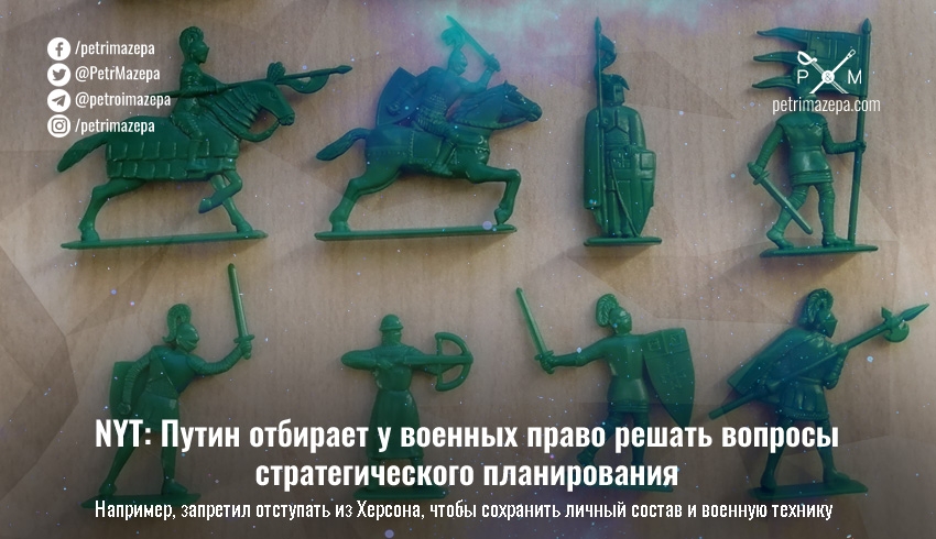 Американское издание New York Times, со ссылкой на неназванного чиновника американской администрации, пишет о том, что российский лидер Владимир Путин все активнее вмешивается в вопросы стратегического планирования боевых действий. Среди последних его решений называют запрет отступать из Херсона.