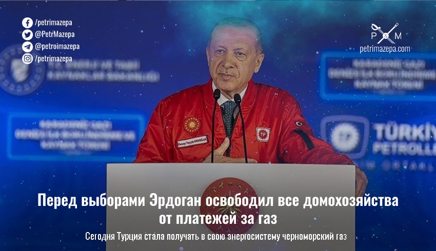 Президент Турции Реджеп Тайип Эрдоган выступил на церемонии начала поставок природного газа с месторождений Черного моря в энергетическую систему Турции, где пообещал всем бесплатный газ. Совершенно случайно церемония прошла менее чем за месяц до президентских выборов.
