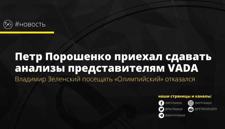 Кандидат в президенты Петр Порошенко прибыл на НСК «Олимпийский» для сдачи анализов представителям Добровольческой антидопинговой организации (VADA). Его оппонент и лидер первого тура Владимир Зеленский от сдачи анализов отказался, а в качестве аргумента его команда сообщила что «анализы сданы».