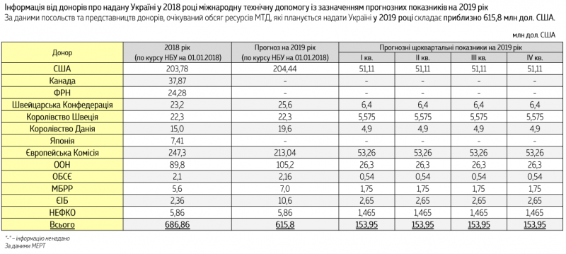 Минфин сообщил, что прогнозирует 615,8 млн долл. донорской помощи для Украины. Лидерами по её предоставлению являются Еврокомиссия (213,04 млн долл.), США (204,44 млн долл.) и ООН (105,2 млн долл.) Об этом говорится в дополнительных материалах макроэкономического прогноза.