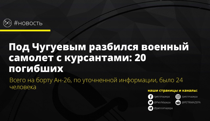 В Харьковской области около Чугуева в 20:50 при заходе на посадку упал военный самолет Ан-26. По данным диспетчера аэродрома, на борту было 24 человека. На время публикации новости известна судьба 22 из них – 20 погибших и 2 выживших, которых доставили в больницу.
