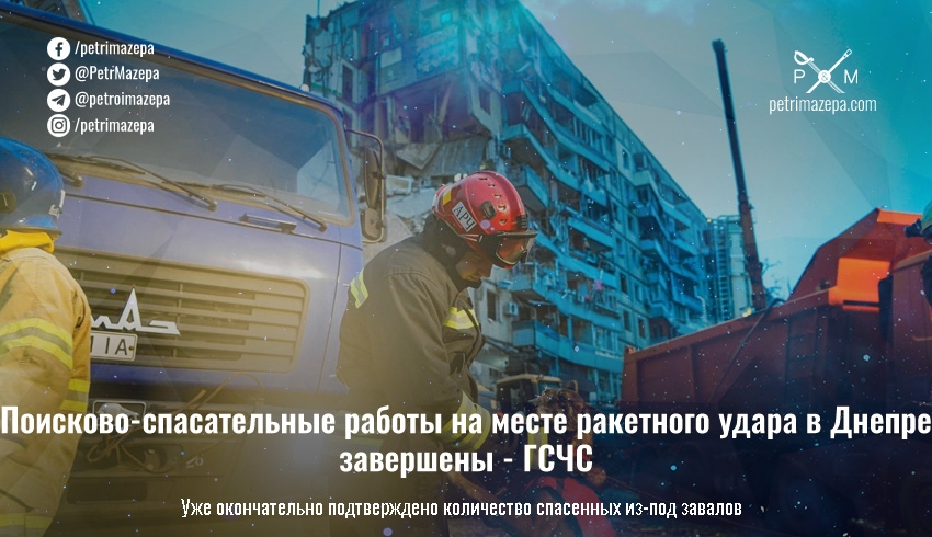 Поисково-спасательные работы в г. Днепре на месте ракетного удара врага по многоэтажке завершены. Об этом сообщает ГСЧС.