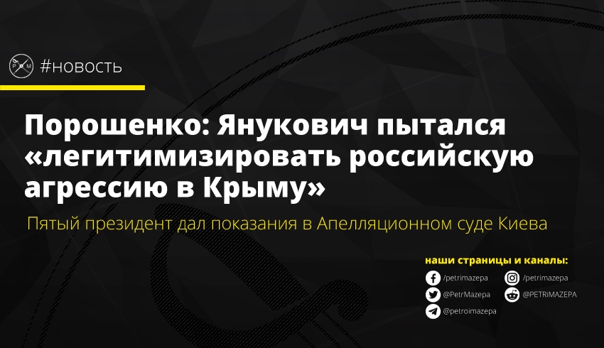 Пятый президент Петр Порошенко дает свидетельские показания в Апелляционном суде Киева по делу о государственной измене беглого президента Виктора Януковича. Среди прочего, он ответил на вопросы адвокатов Януковича об обстоятельствах аннексии Крыма в 2014 году.