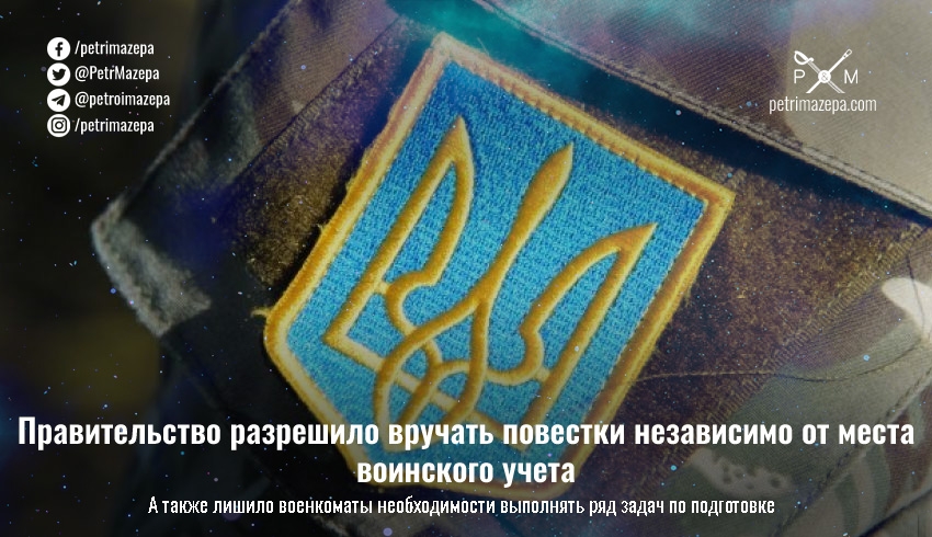 Кабинет министров Украины внес изменения в положение о территориальных центрах комплектования и социальной поддержки (бывшие военкоматы). Им разрешили вручать повестки военнообязанным независимо от места нахождения на воинском учете.