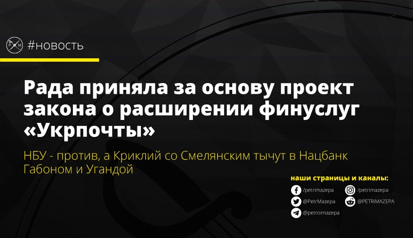 Верховная Рада в первом чтении приняла за основу законопроект 2788-д «О внесении изменений в некоторые законодательные акты Украины относительно финансовых услуг в области почтовой связи», который предусматривает расширение спектра финансовых услуг «Укрпочты». В НБУ выступили с критикой такого законопроекта, а министр инфраструктуры и глава «Укрпочты» доказывают необходимость таких изменений.